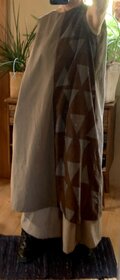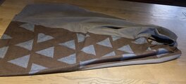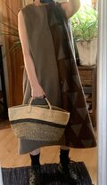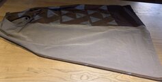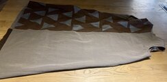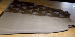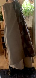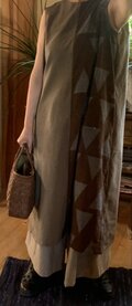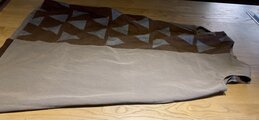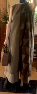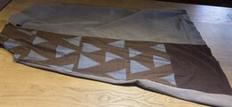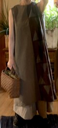 和色の海松茶のようなグレーのような素敵なお色味の無地に茶色の三角模様、後ろ身頃裾には茶系の変形ストライプを組み合わせました。