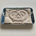 コットンリネンのセルビッチデニムのマットです。プレッツェル柄をミシンステッチでキルティングしています。間にキルト芯を挟んでいます。