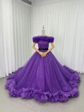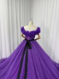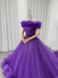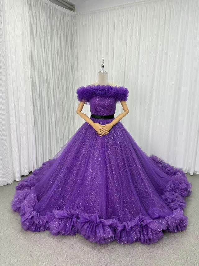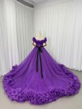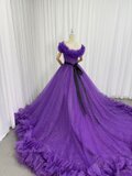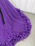 カラードレス パープル 取り外しオフショルダー シークインチュール ラッフルフリル ロングトレーン 披露宴