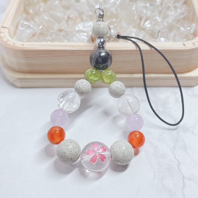 ✦大切な治療・手術、リハビリなどにそっと寄り添う 天然石ストラップ|桜水晶・スギライト・北投石 ペリドットNo.800S