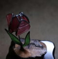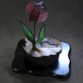 ガラスの中に見える微かな濃淡や揺らぎは、スランピング技法による手仕事ならではの表情。ステンドグラス技法の黒いラインが花びらを包み込むように走り、繊細さの中に引き締まった輪郭を与えます。足元のステンドグラスの葉は深みのある緑で、光を受けて柔らかく表情を変え、全体に落ち着いた調和をもたらしています。