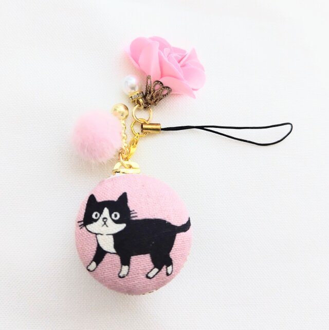のんびりお散歩ネコちゃん柄スモークピンク色、綿リネン生地のマカロンポーチです。