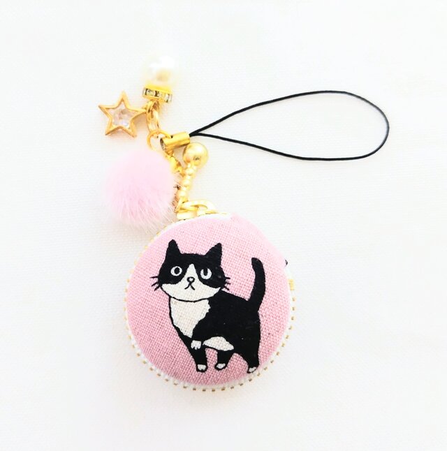 のんびりお散歩ネコちゃん柄スモークピンク色、綿リネン生地のマカロンポーチです。