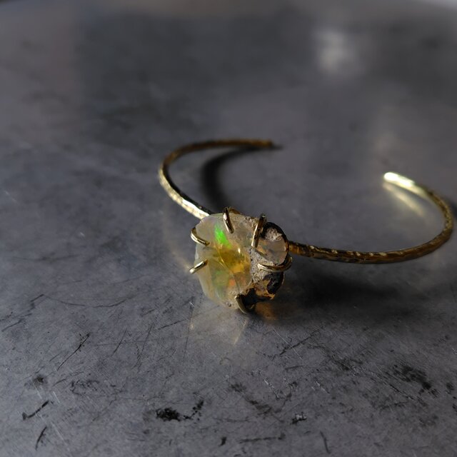 遊色がふんわりやさしく浮かぶエチオピアオパールの原石を真鍮バングルに仕立てました。
