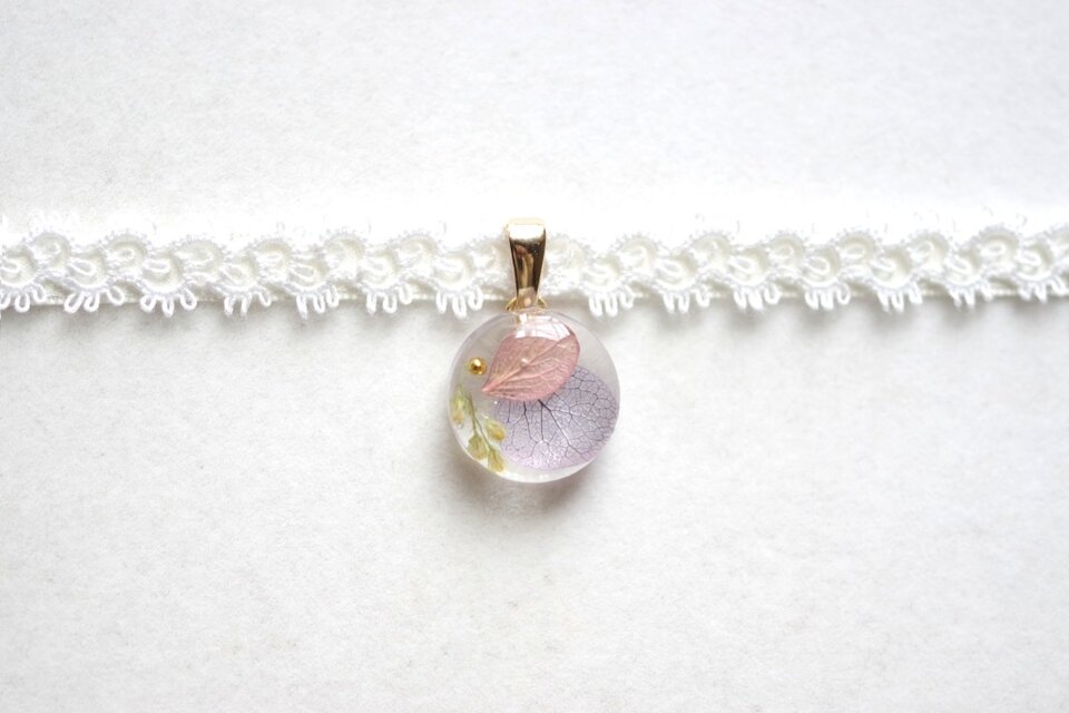 二色の紫陽花の花びらと葉っぱ、ブリオンを沈めた可憐で素朴なレジンを、サテンリボンにタティングレースで装飾を施したチョーカーに仕上げました。