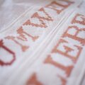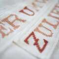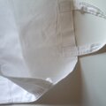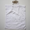 クロスステッチの刺繍生地を縫い留められた白いエコバッグ。