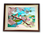 心地よい春の日差しの下、満開の桜の枝に集う雀たちの姿を映し出したステンドグラス風のインテリアアートです。淡いピンク色で彩られたグラスアートは、光を通すことで一層鮮やかに輝き、あなたの空間に春の訪れを告げてくれます。
