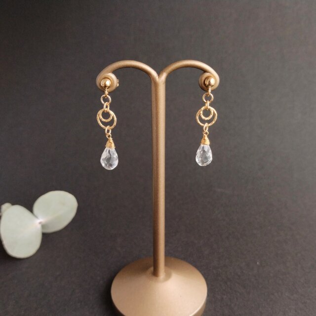 上質な水晶とキラッと輝く14kgfの輪を組合せた、シンプルながらちょっとユニークなデザインピアス(イヤリング)です。