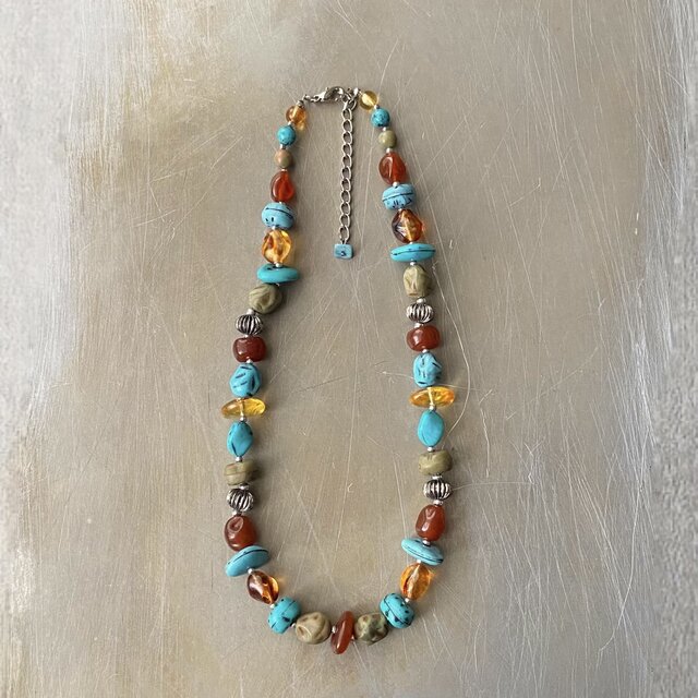 まるで天然石のようなラフカットのビーズが魅力的なUSAヴィンテージネックレス。ヴィンテージならではのレトロな色合いがお洒落な雰囲気。存在感がありスタイリングを明るく彩ってくれます。