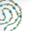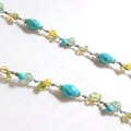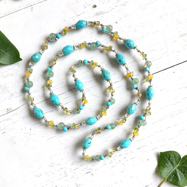 明るいターコイズカラーのマグネサイトをメインに、キミドリやイエローの石を取り入れたロングネックレスです。