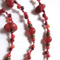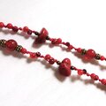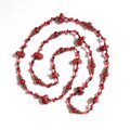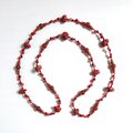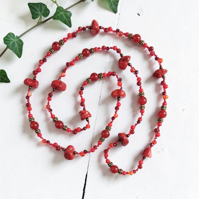 赤い石や珊瑚(サンゴ)を赤い糸で編み込んだエンドレスロングネックレスです。