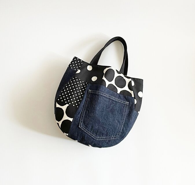 【1点限定】デニムポケット パッチワークバッグ(ドット・A4対応)