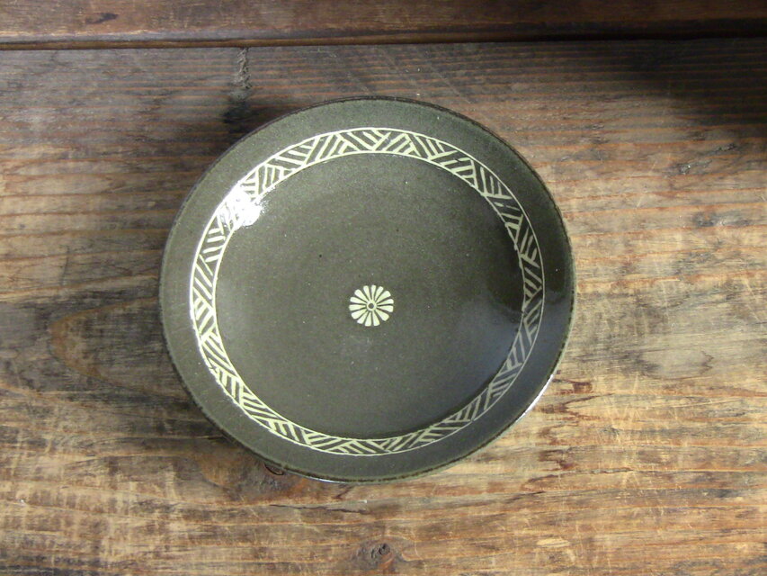 ●皿の内側に竹串で描いた模様の凹み(溝)と印花とうい花模様に細い筆を使って白い化粧泥を埋め込みます(象嵌)。
