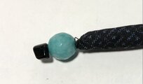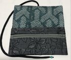 中綿を入れ、正絹の藍大島紬の着物で作ったループを付け、ループの先にトルコ石とオニキスを付けています。