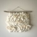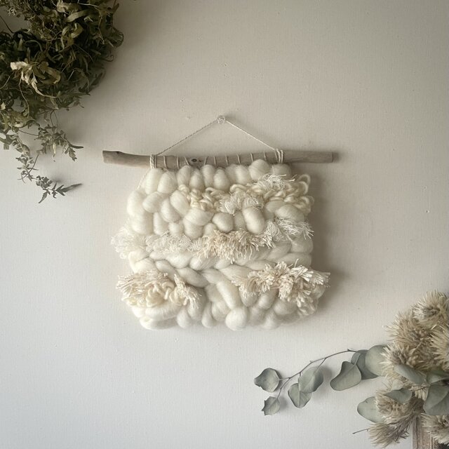 みるく色の羊毛をたっぷりと使用し、極太モヘアやコットン、ファンシーヤーン等と組み合わせ、素材感も楽しんで頂けるよう織りあげた一点もののタペストリーです。