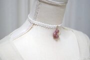 不透明な光沢のあるピンクの粒を三つ、そしてお花にパール、ブリオンを沈めた透明の粒を一つアクセントに連ねた可憐なレジンを、サテンリボンにタティングレースで装飾を施したチョーカーに仕上げました。