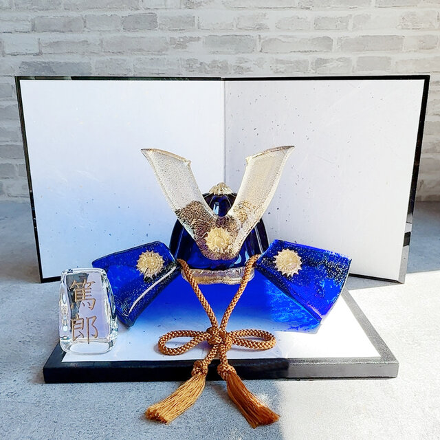 新作【紺碧】ガラスの兜(プラチナ箔&本金箔)和にも洋にも合うカブト飾り、化粧箱つき:端午の節句