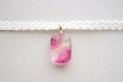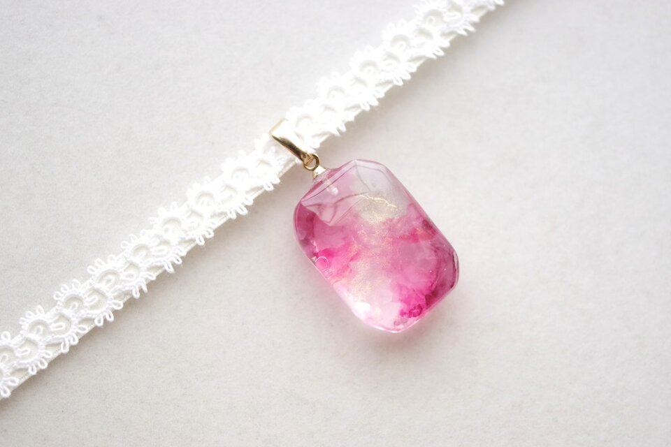 滲んだようなピンクと、横切るゴールドのラインが華やかで存在感のあるレジンを、サテンリボンにタティングレースで装飾を施したチョーカーに仕上げました。