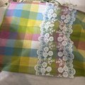 リネン製レースを挟んだ可愛いブロックチェック柄のキッチンファブリック