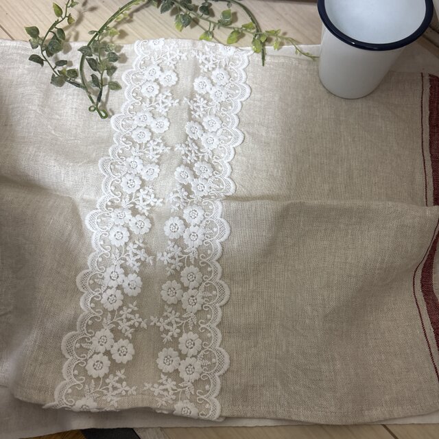 ふんわりリネン製赤耳残しにレースを挟んだキッチンファブリック