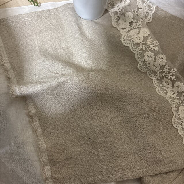 リネン製端耳残しレースを挟んだ可愛いフリークロスのキッチンファブリック