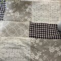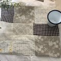 リネン製色々な花刺繍生地のパッチワークにした可愛いフリークロスのキッチンファブリック