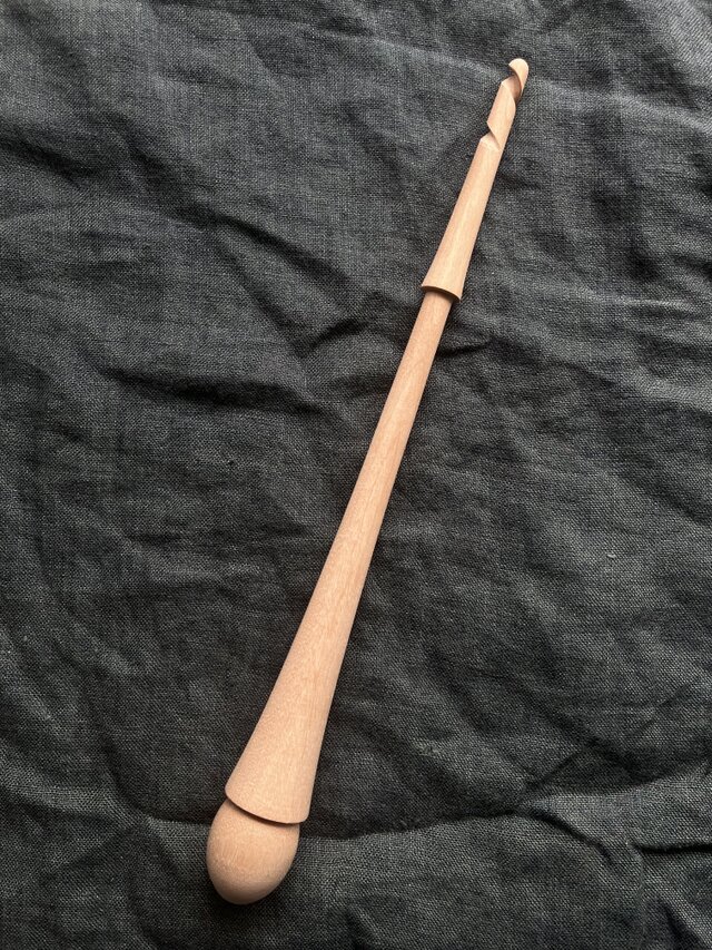 フレンチスピンドルタイプで、上端に螺旋の溝が彫ってあります。この溝に糸を引っ掛けて、接地させずに回転させて紡ぎます。螺旋の溝が左回り(最上端中央から見て反時計回り)のものが阿(写真右)、右回り(最上端中央から見て時計回り)のものが呍(写真左)です。阿はS撚り、呍はZ撚り専用です。阿は左手、呍は右手で回すと回しやすいです。