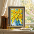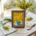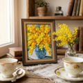 「春を告げる、幸せの黄色い花束」は、春の訪れを贈る特別な油絵作品です。このアートは、鮮やかなミモザの花束を重厚感のあるタッチで描き出し、観る人の心を明るく照らします。