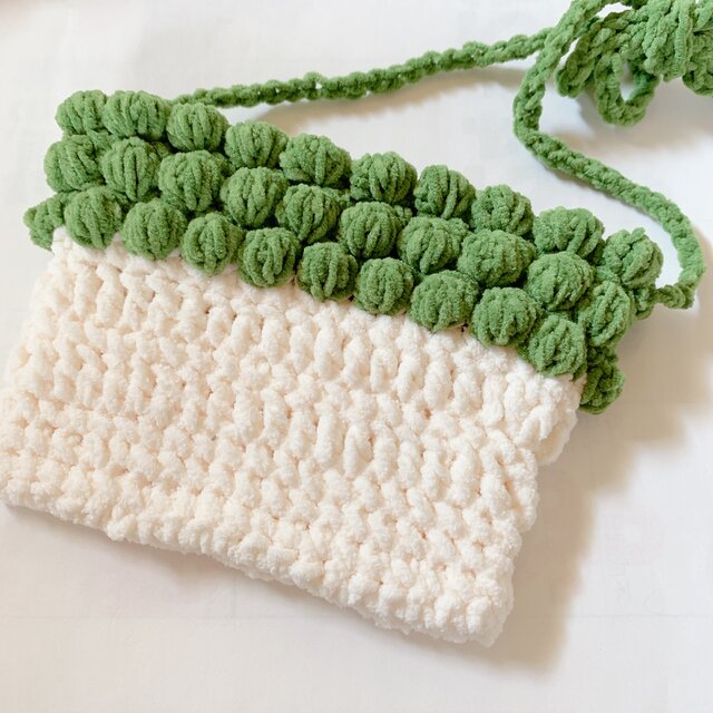 上部には、ぽこぽことした立体編みでグリーンをあしらい、まるで小さな植物のようなデザインに仕上げました。