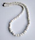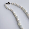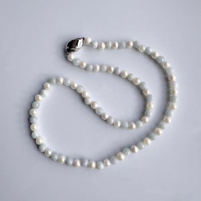 ナチュラルな美しさが魅力、一粒一粒連なる一連のアコヤパールと翡翠のネックレスです。自然のままの色合いを大切にした無調色アコヤパールと落ち着いた緑がアクセントとなり、気品と落ち着きを感じさせるネックレスに仕上げました。
