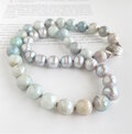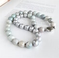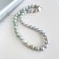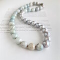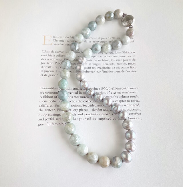 シルバー系のコーティングを施したアマゾナイト(天然ブルークォーツァイト・マルチアマゾナイト)にサークルの入った大粒のシルバー色の淡水パールを加えたチョーカー。