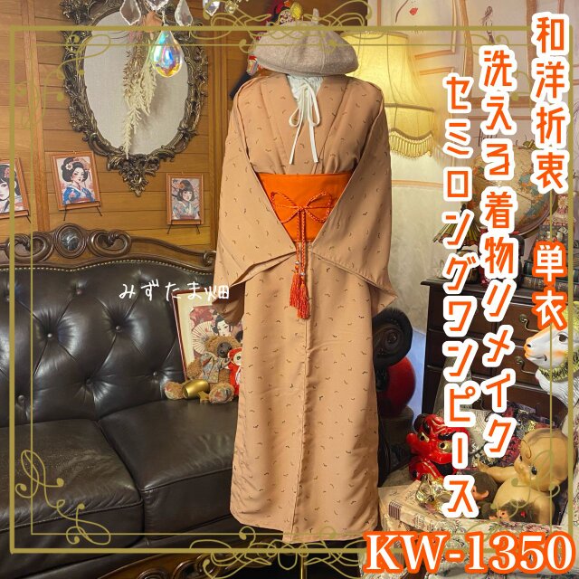 単衣着物リメイク セミロングワンピース/ドレス/洗える化繊 帯サッシュベルト 陽だまりのオレンジと時を結ぶ KW-1350