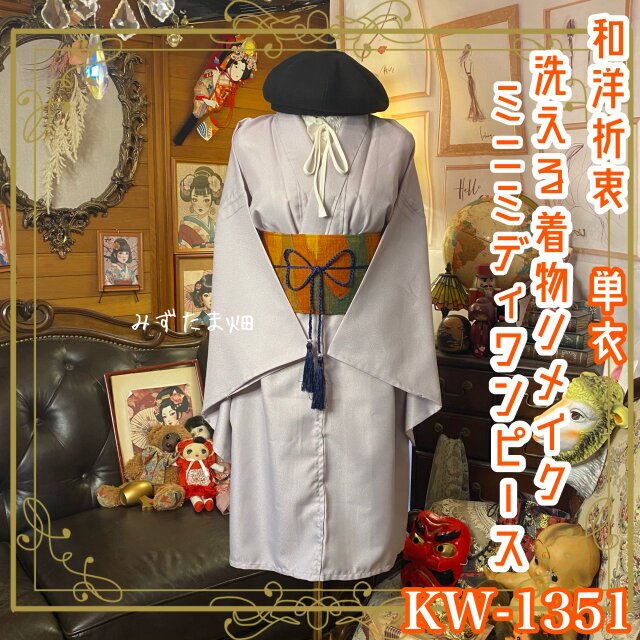 単衣着物リメイク ミニミディワンピース/ドレス/洗える化繊 名古屋帯 灰紫の深淵とモノクローム・シグナル KW-1351