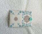アイボリーの布地に水色と薄めのブラウンの刺繍糸を使用。