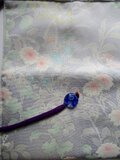 中綿を入れ、花柄の正絹の着物で作ったループを付け、ループの先におはじき型のトンボ玉と山サンゴを付けています。
