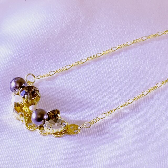 三日月の透かしパーツに華やかなパールとガラスストーンを付けて豪華に仕上げました