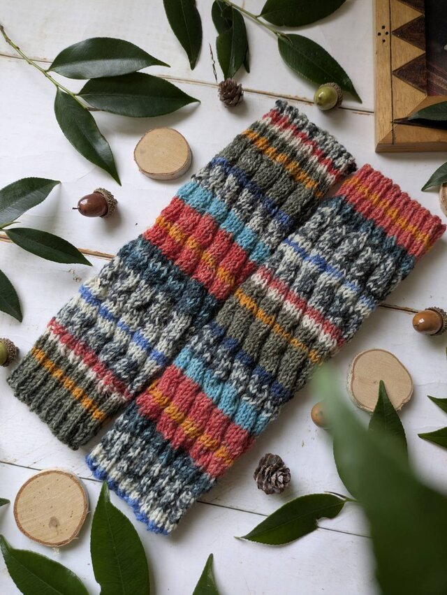 秋の小径をランデブーしているような楽しげな柄の、スパイラル編みレッグウォーマーです。