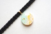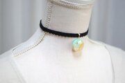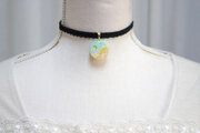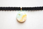 明るいパステルカラーの夜空と輝く三日月がどこか浮世離れしたカラーリングのレジンを、ベルベットリボンにタティングレースで装飾を施したチョーカーに仕上げました。