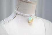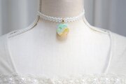 明るいパステルカラーの夜空と輝く三日月がどこか浮世離れしたカラーリングのレジンを、サテンリボンにタティングレースで装飾を施したチョーカーに仕上げました。