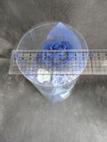 プリザーブドフラワーの青い大輪の薔薇と3色のミニ薔薇とかすみ草をあわせた花束を透明クリアケースに入れました。