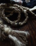 ゆったりしたワンピースにゆるやかに重ねたり。紐はウールとアクリル混の毛糸を、藍染めウッドビーズとともに編んだものです。
