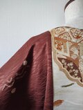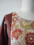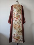 丸帯だった重鎮模様の豪華な帯地と絞り染めの入った小豆色の着物生地とを組み合わせたロングワンピースとなります。地模様のある着物生地は光沢感もあり所々に入る絞り染めも効果的に帯地の色合いともよく合って双方の魅力を引き立て合っているような気がします。