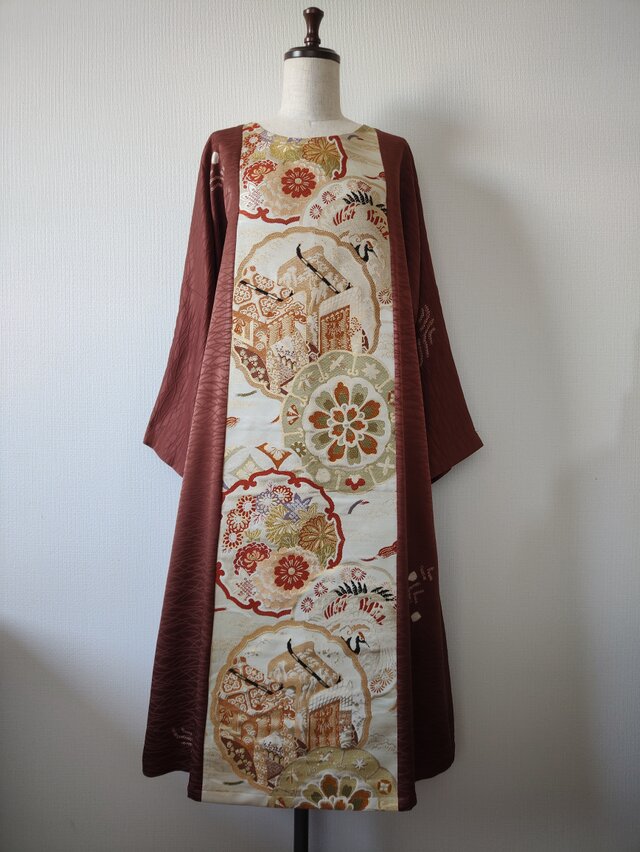 豪華丸帯の落ち着いた色合いの中に花や人力車、首を覗かせる鶴の姿などもあり微笑ましく日本の染織を存分にお楽しみいただけるワンピースです。