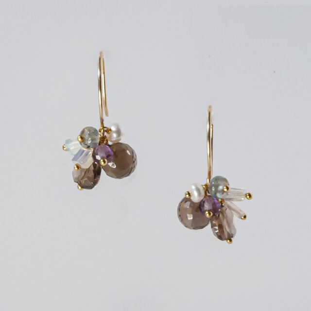 落ち着いたブラウンの6mmラウンドのスモーキークォーツを主役に、アメジスト、モスアクアマリン、パール、オパールを束ねたブーケのようなピアス。