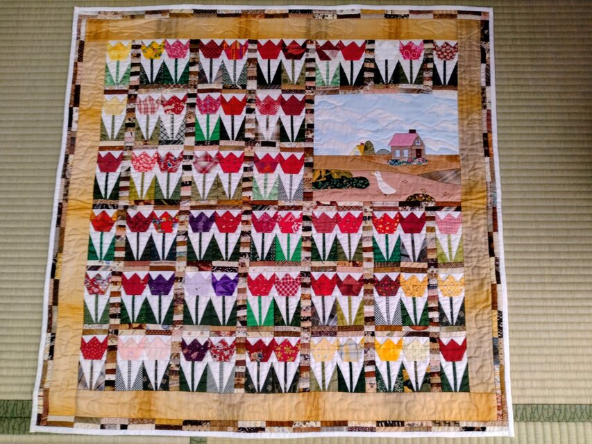 縦84cm✕横86cm チューリップの窓から見える長閑な風景。 豊富なパッチワーク技術が備わった大作です。