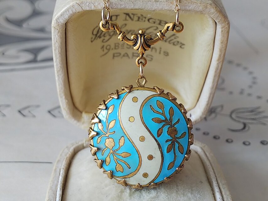 フランスアンティーク、1800年代後半~1900年代初頭に製造された美しいエナメルボタンを用いてお作りしましたネックレスです。