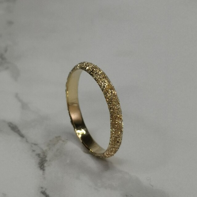 表面にダイヤモンドダスト加工またはスターダスト加工と呼ばれるテクスチャーを施した甲丸リングです。