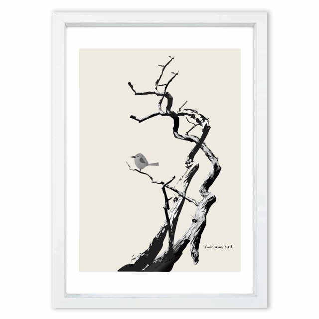 木に宿る鳥 モノトーンの中に愛らしい鳥を描いたアートポスター 和洋のお部屋に。