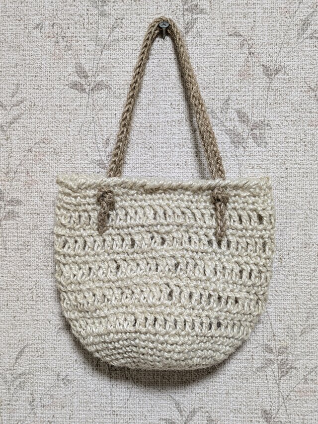 ジュートヤーンで編んだ、シンプルなミニバッグです♡ シンプルなので、お好きなブローチやピンバッジなど付けて可愛くアレンジ出来ます!! バッグの深さ:約15cm 丸底の直径:約10cm