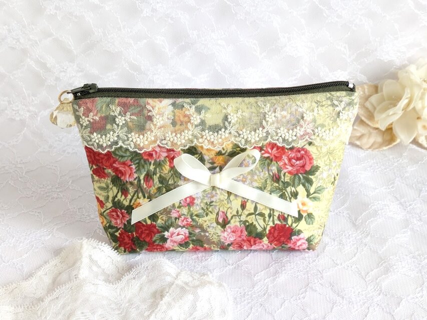 華やかなバラ柄の生地に、繊細なレースとリボンをあしらった大人可愛いポーチです。